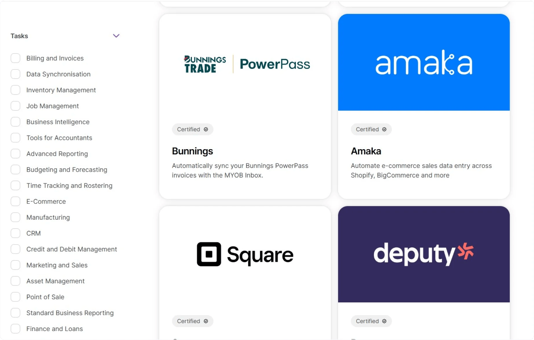 MYOB connects with many other tools, organised into helpful categories like E-commerce (Shopify, BigCommerce), POS Systems (Square, Retail Express), CRM (Salesforce), Expense Management (ProSpend), Project Management (Autodesk, simPRO), and so much more.